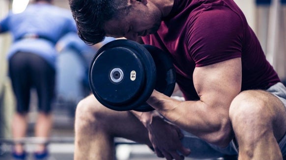 - Grab a dumbbell with both hands and hold it in the centre of your body