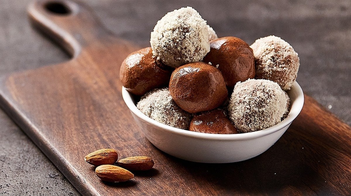 3. Roll each one in ground almonds to coat (any kind of chopped nut will work for this!) then enjoy straight away or keep in the fridge for later.