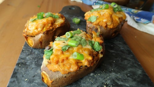 Niall Kirkland is serving up yet another incredible idea for you to get creative with in the kitchen. Loaded with baked sweet potato, crumbled feta, tangy salsa, chilli-lime soured cream, crisp shredded lettuce, and plenty of hot sauce — these soft-shell tacos are a flavour explosion to waiting to happen.