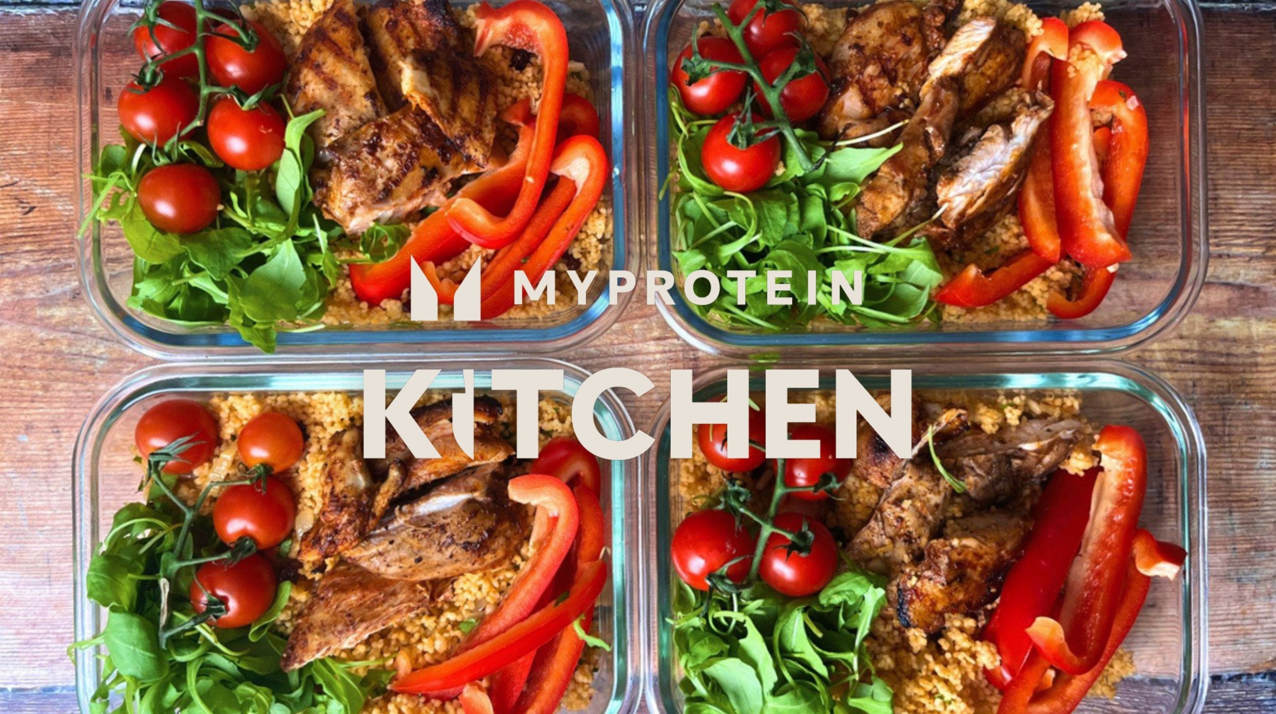 Add a bed of couscous to each of your meal prep containers and top with the sliced harissa chicken. Finish with whatever extra veggies you prefer — Niall’s gone for some crisp red pepper, cherry tomatoes, and peppery rocket.