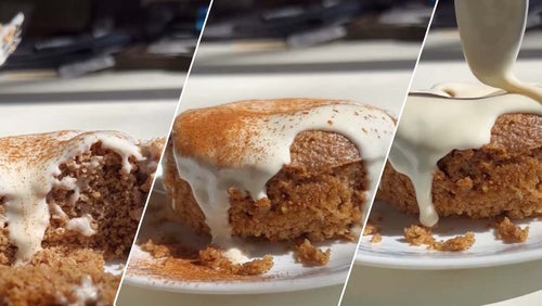 A breakfast sponge that’s twist on the TikTok baked-oats classic. It’s delish, and packed full of protein.