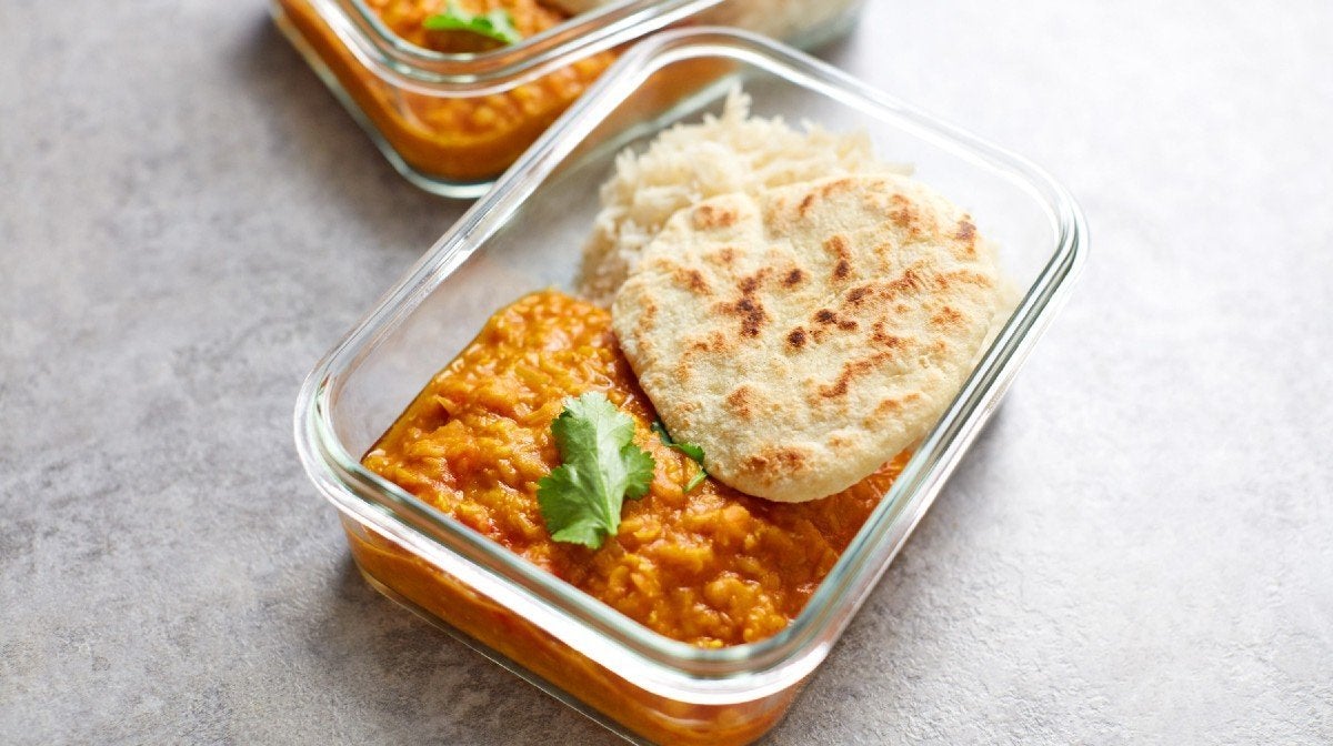Once your one-pot lentil dahl has cooked, stir well and then portion up with rice into meal prep containers. Add a mini naan to each one and garnish with coriander.