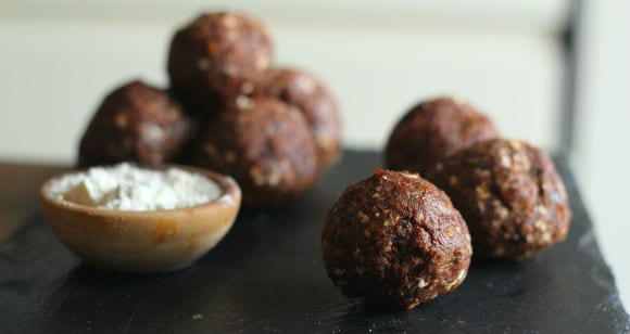 To the dry mix mash in the processed dates and peanut butter. – a bit of elbow grease may be required here!