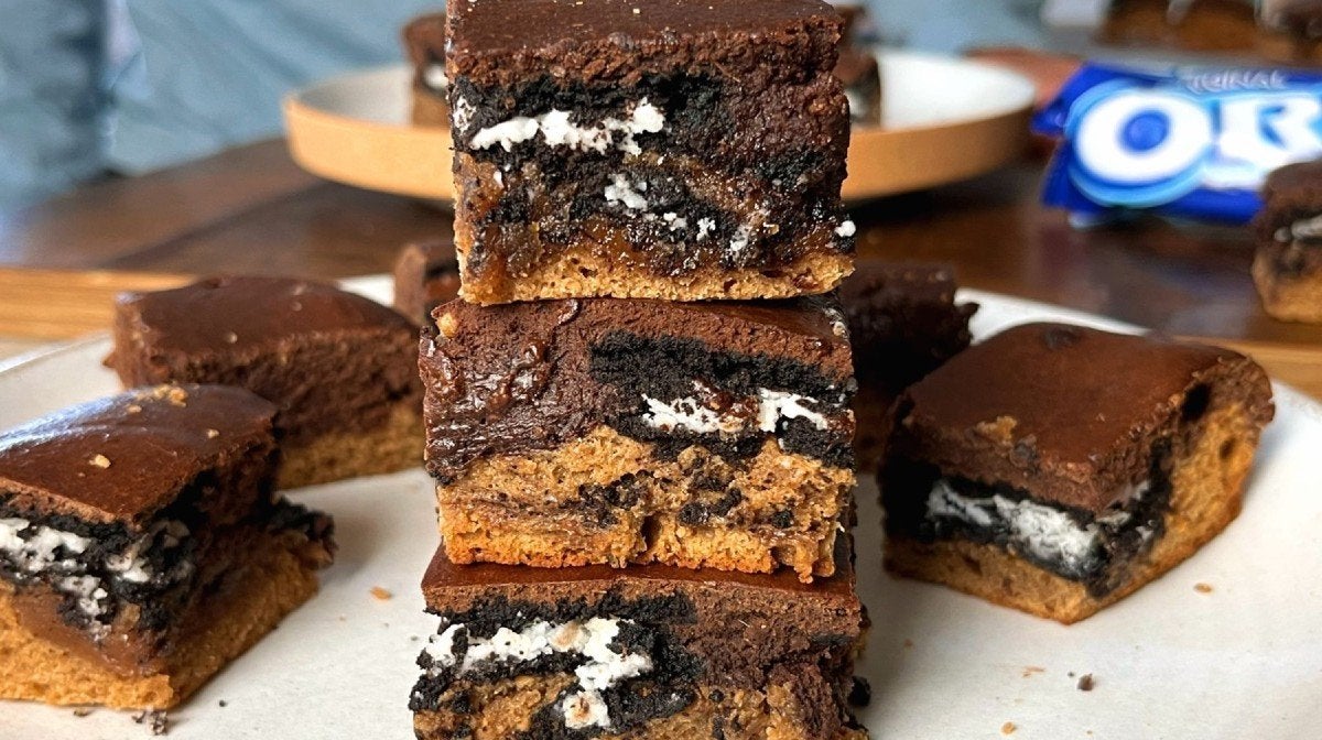 This incredibly indulgent recipe from Niall Kirkland honestly had our mouths watering from the name alone. He’s combined a layer of thick, sticky cookie dough with rich, gooey brownie and stuffed Oreo biscuits in the centre just for good measure. We told you it was a showstopper.