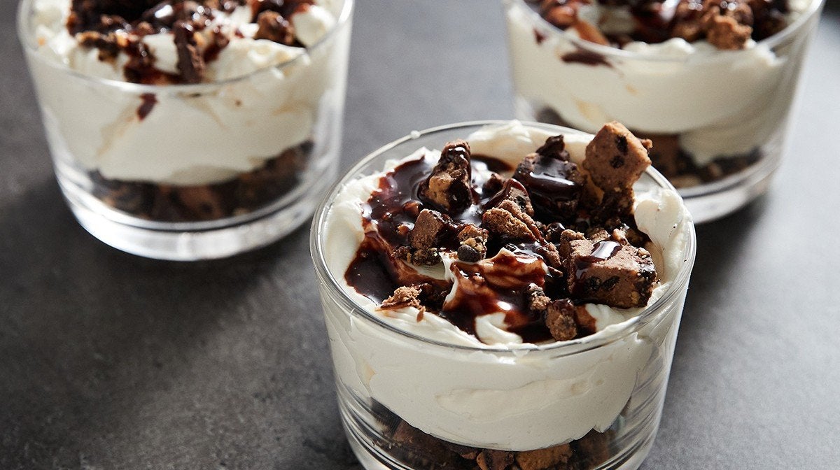 4) Top each one with the leftover pieces of Vegan Carb Crusher and if you’re feeling extra indulgent drizzle with dark chocolate sauce.