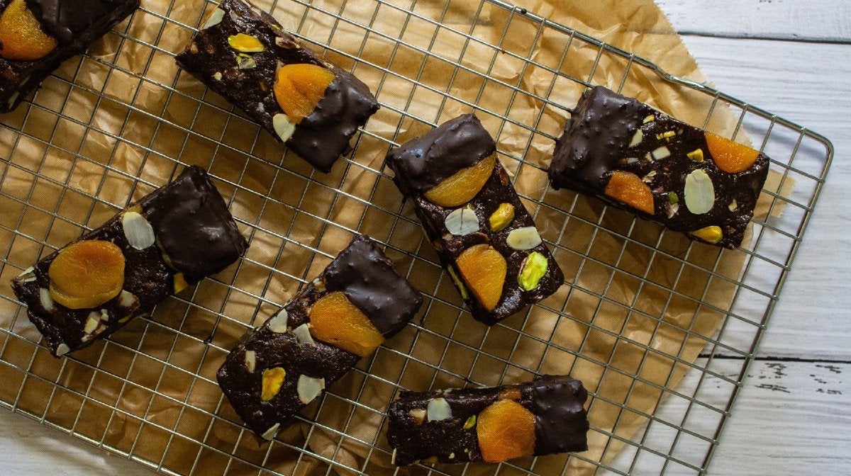 - Flatten the mixture evenly across the baking tray and then press a few extra dried apricots on top. Leave in the fridge to chill for 2 hours.