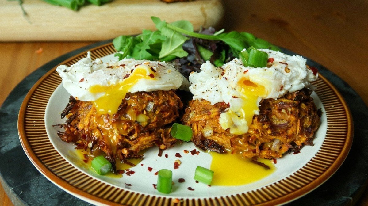 - Serve your poached eggs on top of the sweet potato rostis, and garnish with chilli flakes and black pepper.
