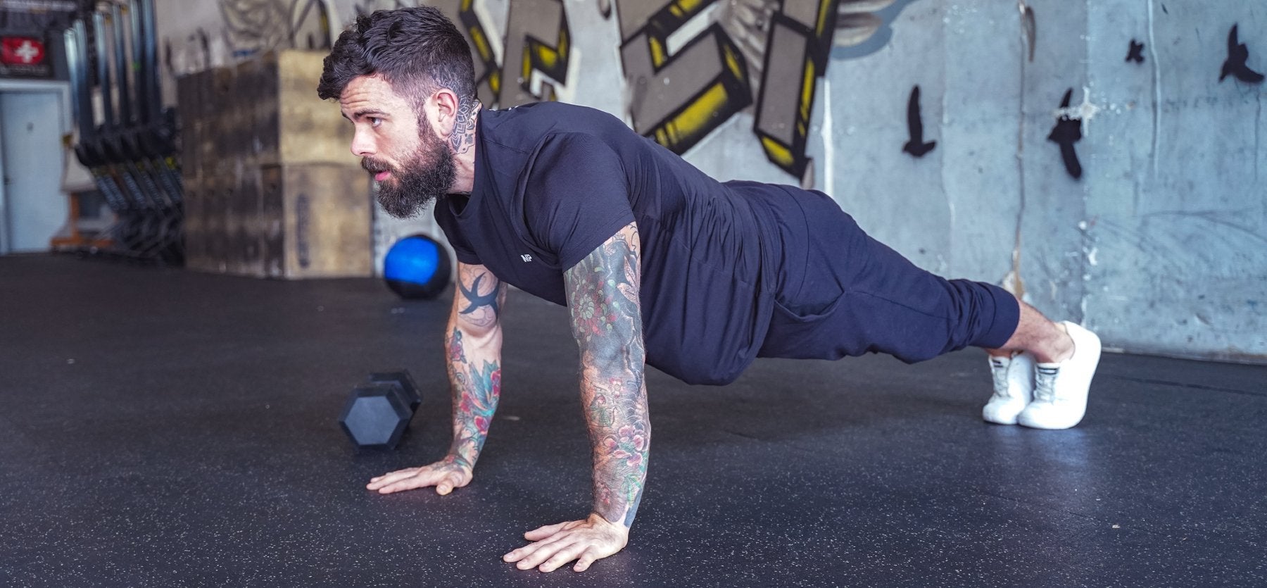Drop to a plank position and begin the press up either in a full press up position or on your knees if you struggle to complete a full press up. Once your chest and hips make contact with the floor come to a stop before pressing up from the floor.